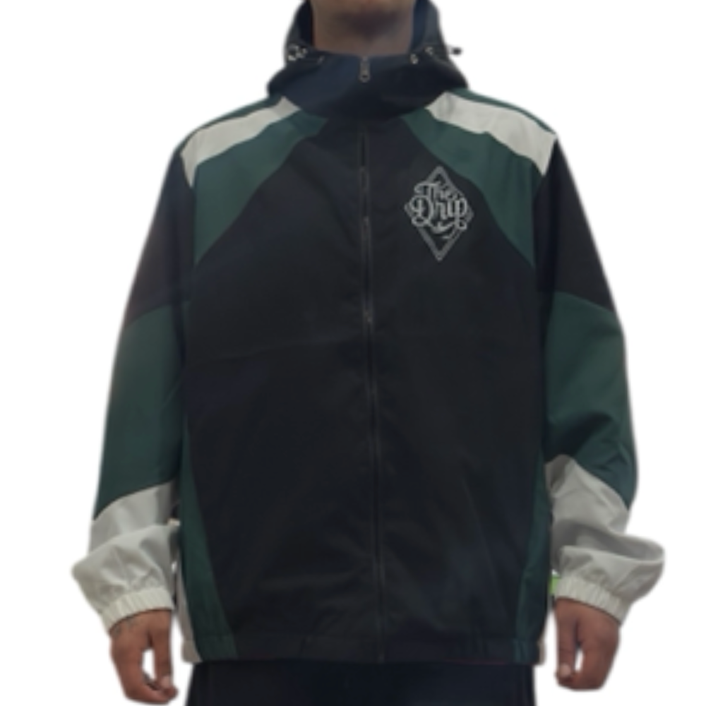 Chaqueta ligera técnica con capucha, diseñada para uso diario y exterior. Tejido 100% poliéster (no elástico), cierre con cremallera y construcción limpia tipo cortavientos. Gráfica The Drip en gran formato en la espalda.